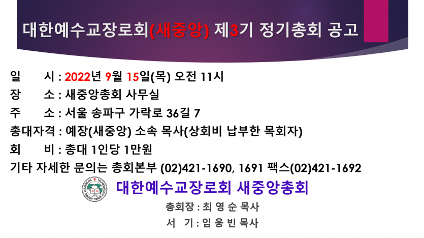 목록 대한예수교장로회(새중앙) 제3기 정기총회 공고 페이지 정보 작성자 새중앙 댓글 0건 조회 819회 작성일 22.08.02 본문 대한예수교장로회(새중앙) 제3기 정기총회 공고 이전글 대한예수교장로회 새중앙총회 107회기(새중앙 3기) 총회장 선거 공지 22.08.16 목록 다음글 새중앙총회 전권위원회 결의사항(2022.7.21) 22.07.21 댓글 0 댓글목록 등록된 댓글이 없습니다.