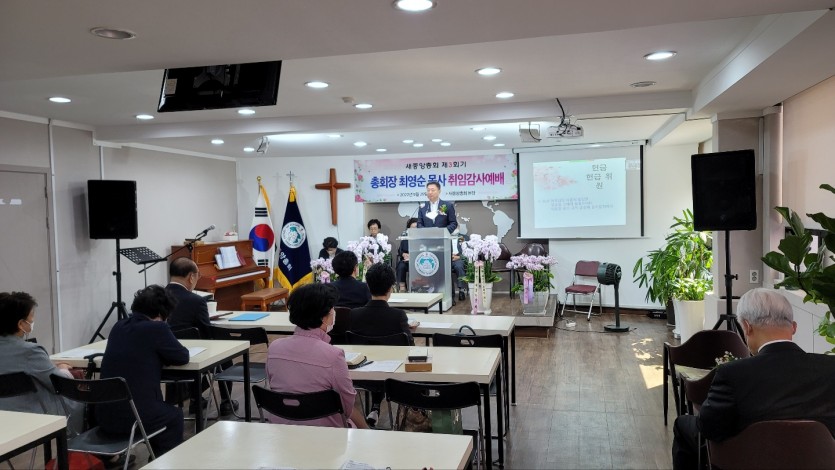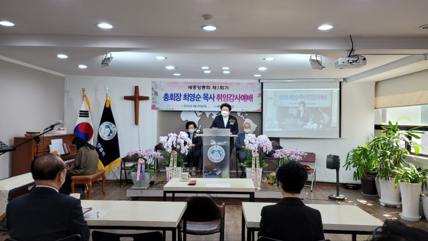 대한예수교장로회 새중앙총회는 29일(목) 오전 11시 총회본부사무실에서 제3회기 최영순 목사의 총회장 취임 감사예배를 드렸다. 전국 각처에서 목양에 열성적인 총회원들이 총회의 발전과 성장을 위하여 헌신을 다짐한 총회장 취임을 진심으로 축하하고 감사하면서 시작한 예배에서 행정부총회장 김교원 목사는 개척자의 신앙(수1:1-9)이란 제목의 설교를 통하여 우리는 불확실한 상황에서 미래를 위해 과거와의 단절이 필연적이지만 달콤한 과거의 습성을 쉽게 떨쳐내지 못하는 상황에서 단호하게 결단해야 하는 지도자는 미지의 세계로 단체를 이끌어야할 책임이 있기에 두렵고 고독하다고 하였다.